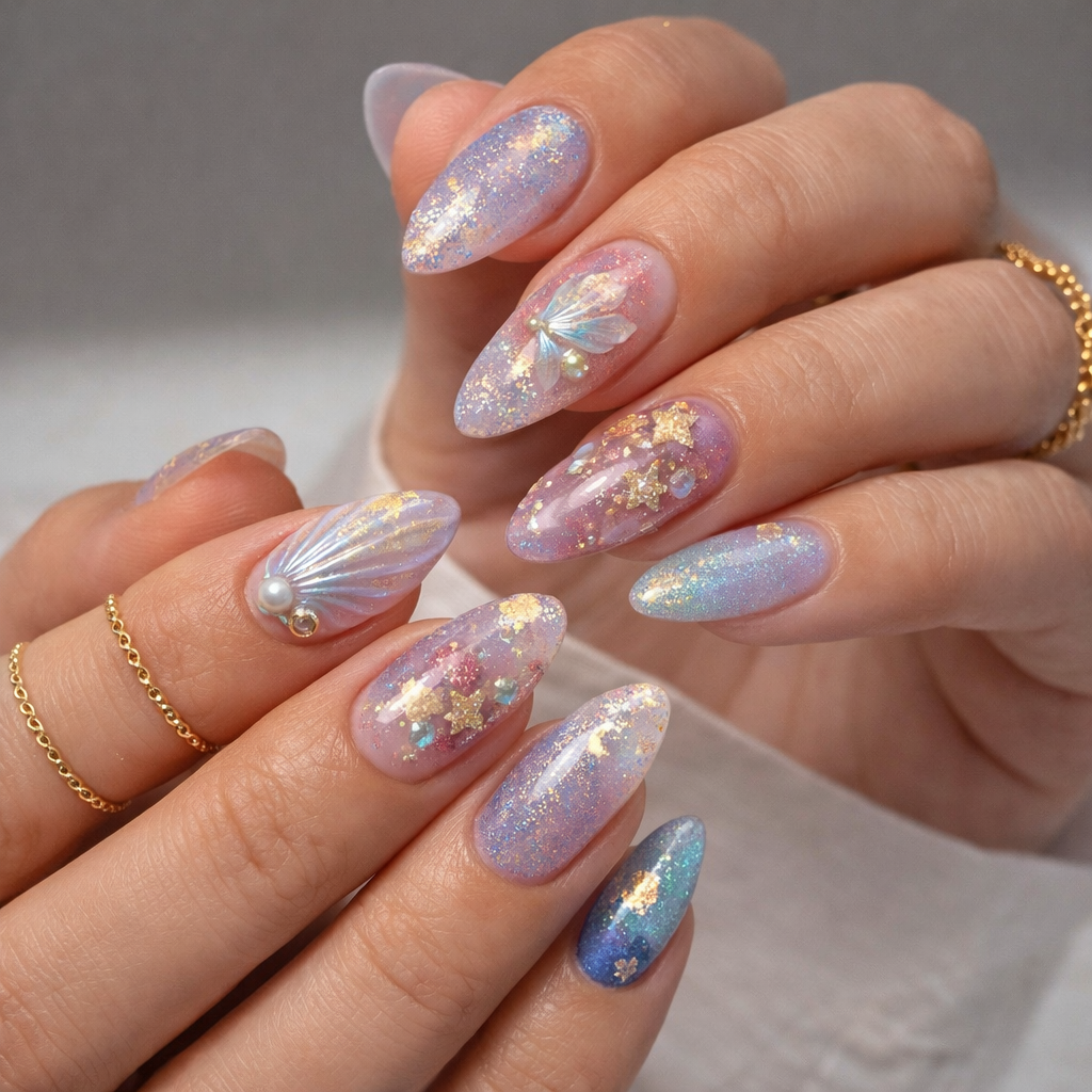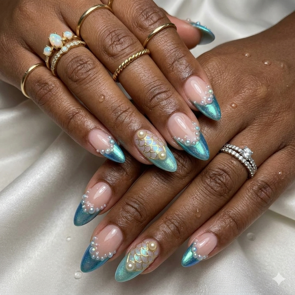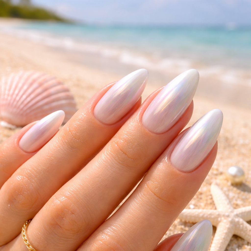 Pearly, reflective finishes inspired by seashells and mermaids are trending hard in summer nails 2026 trends.
