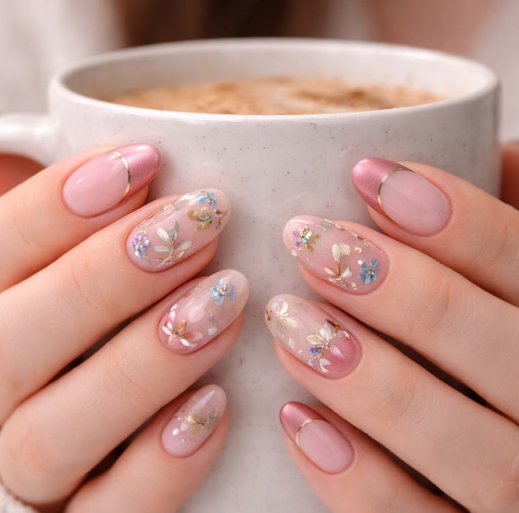 Tiny flowers scattered across nude or pastel bases—subtle but detailed.