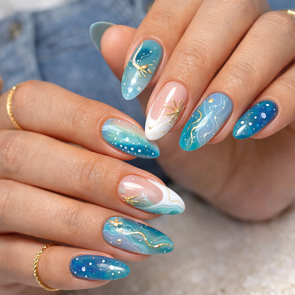 This look blends soft aqua into deep ocean blue, creating a calming, beachy vibe that works on both summer nails short and long shapes.