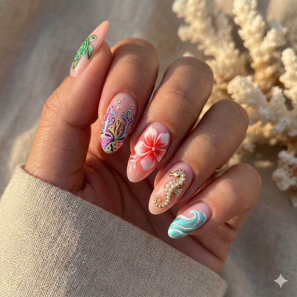 Palm leaves, hibiscus, and soft green tones bring instant vacation energy. This is one of the most aesthetic summer nails designs for 2026.