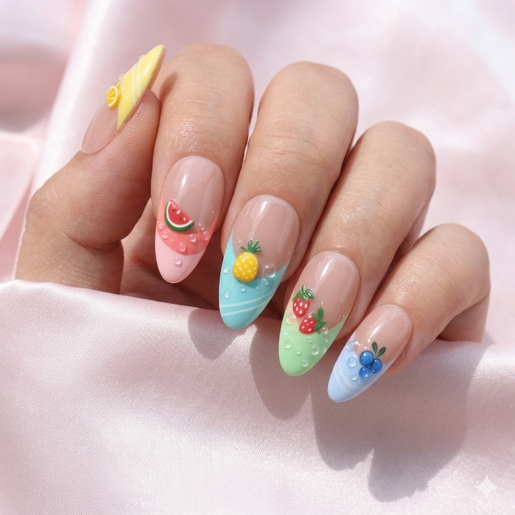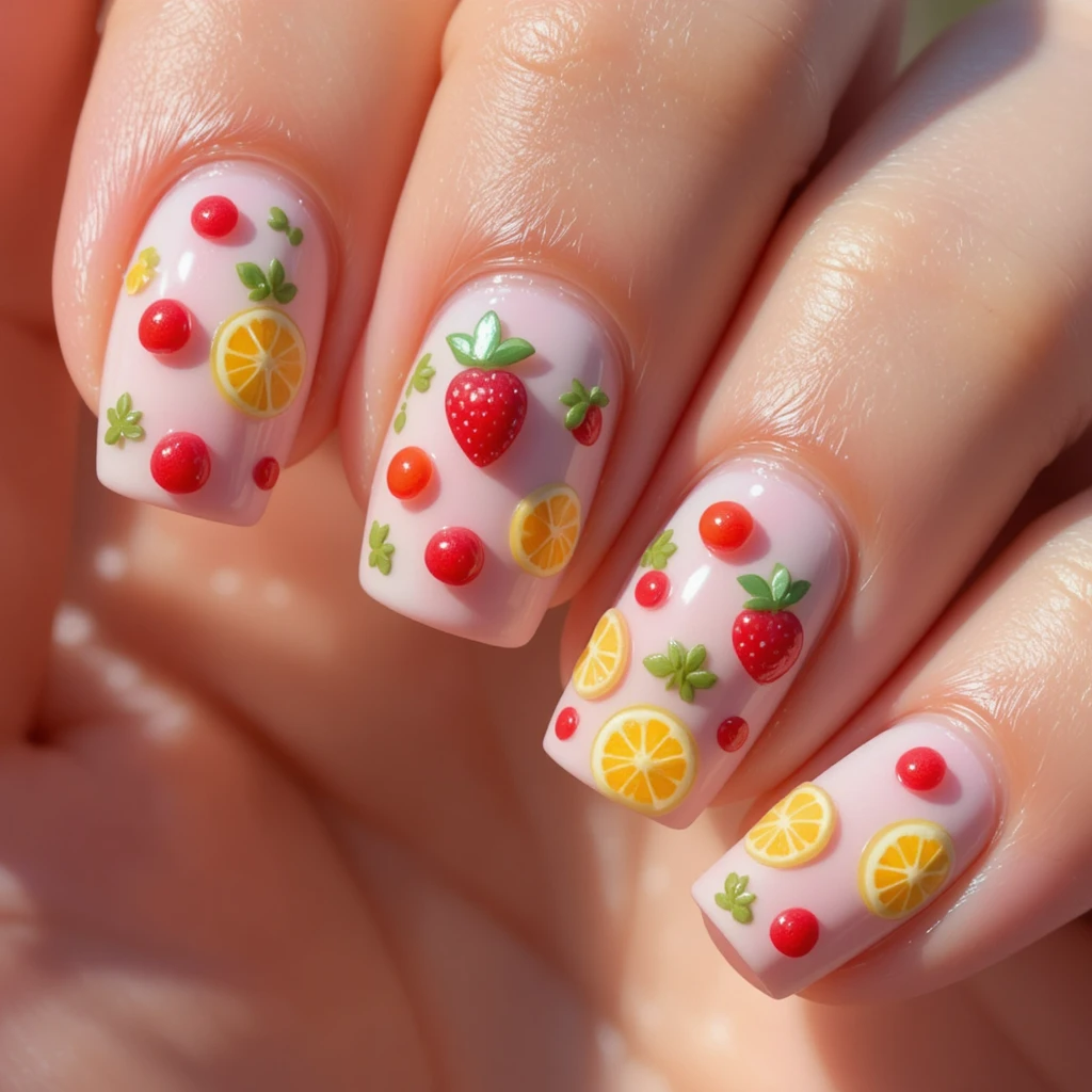 Tiny strawberries, cherries, and citrus slices add a playful twist to your nails.