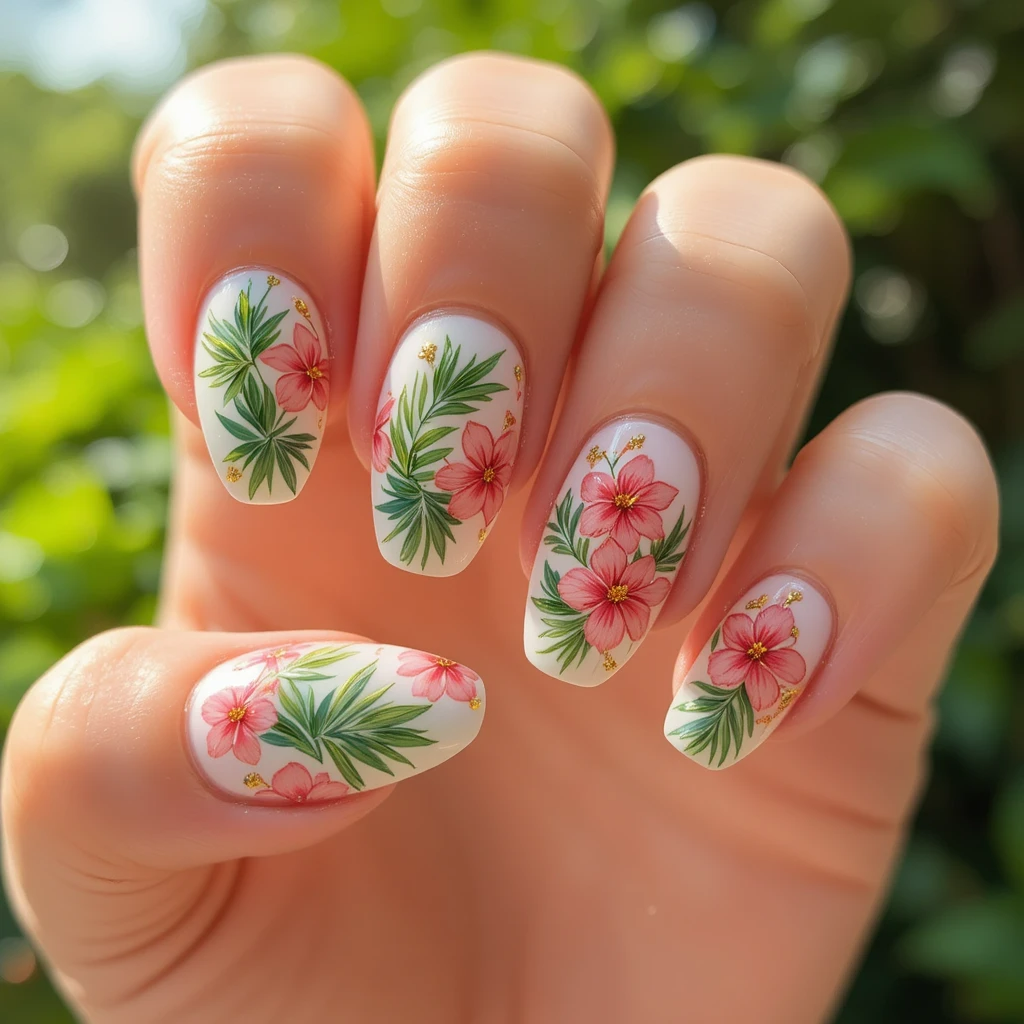 Tropical vibes with palm trees and hibiscus—your nails are officially vacation-ready.
